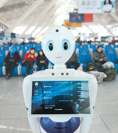 2018年2月3日,服务于青岛北站春运中的智能问询机器人。王海滨摄(人民视觉)