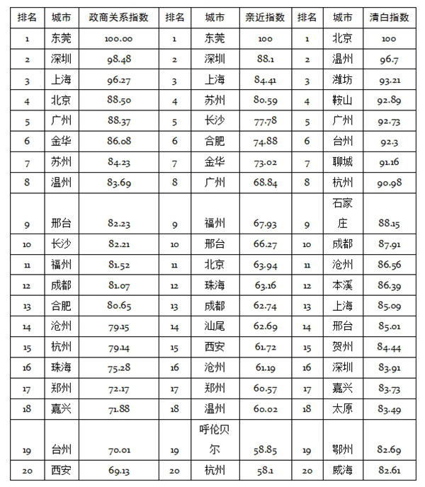 中国城市政商关系排行榜:东莞最健康 超越京沪(表)
