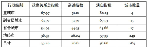 表3 各大区政商关系健康指数比较(4)从行政级别来看,整体而言城市的行政级别越高,政商关系得分越高。总体上,直辖市的政商关系健康指数高于副省级市,后者高于省会城市,最低的是普通的地级市(如表4)。