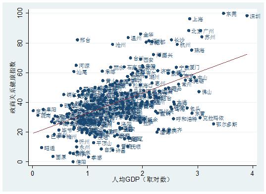 表4 城市级别与政商关系(5)从收入上看,经济发展水平越高的地方,政商关系得分越高。数据分析表明,政商关系健康指数与人均GDP的相关系数高达0.53(如图2)。