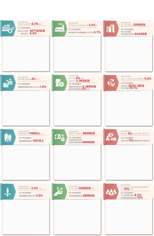 国民经济平稳发展 国家统计局发布的统计公报显示,2017年我国国内生产总值为827122亿元,同比增长6.9%,符合年度预期目标。 过去一年,在世界经济曲折复苏、不确定不稳定因素增多,国内经济结构性矛盾突出、改革发展任务重的形势下,党中央始终坚持稳中求进的工作总基调,积极创新和完善宏观调控,保持战略定力,不搞“大水漫灌”式强刺激,着力推进供给侧结构性改革,适度扩大总需求,促进了国民经济实现平稳健康发展。 值得一提的是,2017年我国进一步巩固了世界第二大经济体地位,中国对世界经济增长贡献率在30%左右,继续成为世界经济稳定复苏的重要引擎。 (林火灿) 节能减排成绩突出 2017年,我国继续坚定不移推进生态文明建设,积极落实减排承诺,深化供给侧结构性改革,在调整产业结构、提高能效、优化能源结构、控制非能源活动温室气体排放、增加碳汇等方面采取了一系列积极举措,取得了一系列积极成效。当前,服务业已经成为经济的主要拉动力,与工业一起共同支撑中国经济发展,工业也在向价值链中高端延伸,绿色发展新动能正在加快形成。 2017年,全国万元国内生产总值能耗比上年下降3.7%,完成全年目标任务,万元国内生产总值二氧化碳排放下降5.1%,经济增长的质量和效益得到改善。 (熊 丽) 从源头防止乱收费 大力清理和规范涉企收费,优化实体经济发展环境,是贯彻稳中求进工作总基调、推进供给侧结构性改革的重要举措,也是深化简政放权的关键内容。 2017年,国家实施多项降费措施,包括取消、停征或减免43项中央行政事业性收费,降低7项收费标准。取消和减免5项政府性基金,降低2项征收标准。取消工业企业结构调整专项资金。出台阶段性降低失业保险费率、清理规范经营服务性收费等政策。一系列措施的实施,有效减轻了企业负担。 此外,财政部在其门户网站上集中公布了中央和省两级收费目录清单,有助于从源头上防止各类乱收费、乱摊派。 (曾金华) 物价走势符合预期 2017年,全年居民消费价格比上年上涨1.6%,在合理区间运行,符合年度预期目标。 过去一年,我国物价水平运行总体平稳,属于温和上涨。从构成看,CPI涨幅较为温和,有上年基数较高的因素,但主要还是受到食品价格回落的影响。食品价格回落,受到部分鲜活食品周期性波动等因素的综合影响,但也说明食品供给能力进一步增强。从非食品价格看,涨幅有所扩大,特别是服务价格近年来连续稳定上涨,在一定程度上反映了消费升级步伐在加快。 居民消费价格保持在合理区间运行,为我国持续推进价格改革创造了有利的条件,也为创新和完善宏观调控提供了更为宽松的环境。 (林火灿) 财政政策积极有效 财政赤字是国家财政支出超过收入的部分,赤字规模占国内生产总值的比重就是赤字率。2017年,我国安排3%的赤字率,体现了更加积极有效的财政政策取向。2017年的赤字率与2016年持平,但赤字规模随着经济总量基数增加而扩大,有利于确保财政支出强度不减、实际支出规模扩大,增加的支出主要用于支持推进供给侧结构性改革、适度扩大有效需求,保障重点领域支出需要。 同时,2017年赤字安排又体现了防范财政风险的稳妥考量。我国政府负债率和财政赤字率在世界主要经济体中均处于较低水平,债务风险总体可控。 (曾金华) 转移支付倾向民生 2017年我国增加对地方转移支付规模,促进区域均衡协调发展。中央财政对地方一般性转移支付占全部转移支付的比重较上年提高。中央转移支付资金重点向经济发展落后和财政困难地区倾斜,增强了落后和困难地区保工资、保运转、保基本民生的能力。同时,继续保障农业、教育、社保、医疗、就业、生态环保、住房保障等重点领域的专项转移支付。加大专项转移支付清理整合力度,中央对地方专项转移支付项目数量进一步减少。此外,中央财政增加阶段性财力补助规模,并统筹县级基本财力保障机制奖补资金等转移支付,加大对资源能源型等财政困难地区支持力度,兜住保障基本民生的底线。 (董碧娟) 就业形势稳中有进 2017年,在经济增速放缓、结构调整深化、劳动力高位运行的情况下,我国就业形势稳中有进,全国城镇新增就业达到1351万人,创历史新高。 从失业人员和困难群体就业看,就业人数也实现同比增长,超额完成年度任务。就业目标能够圆满完成,得益于几个方面。首先,全年经济稳步增长,为保持就业平稳提供支撑,经济增长的就业弹性明显增强。其次,经济结构优化,特别是第三产业快速发展和新产业、新业态发展势头良好,对就业带动明显。再者,改革红利的释放,创造了大量就业机会。此外,就业形势的稳定,也离不开广大劳动者的自强不息和个人努力。 (韩秉志) 地方举债更加规范 根据“开前门、堵后门”的理念,我国加快建立规范的地方政府举债融资机制,增强地方经济财政发展可持续性,地方政府专项债券制度在其中发挥了重要作用。2017年,财政部还启动发行土地储备专项债券、政府收费公路专项债券,试点发展实现项目收益与融资自求平衡的专项债券品种,打造中国版的地方政府市政项目“收益债”,保障重点领域合理融资需求,更好发挥专项债券补短板的积极作用,丰富地方政府债券品种,引导社会资本加大投入。 2017年,全国地方累计发行土地储备专项债券2407亿元、发行政府收费公路专项债券440亿元,同时深圳