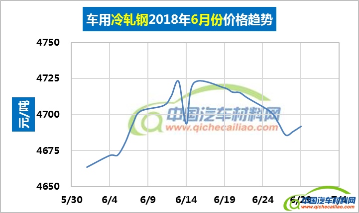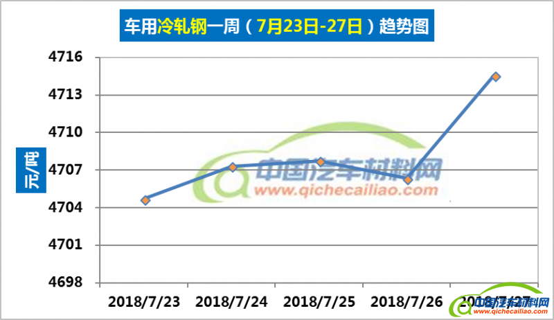 冷轧钢本周价格总体也呈小幅上涨趋势,一周内涨幅为9.89元,本周五价格涨至4714.58元/吨。车用冷轧钢本周平均价格为4708.13元/吨,较上周上涨0.14%,较6月份均价上涨0.21%。