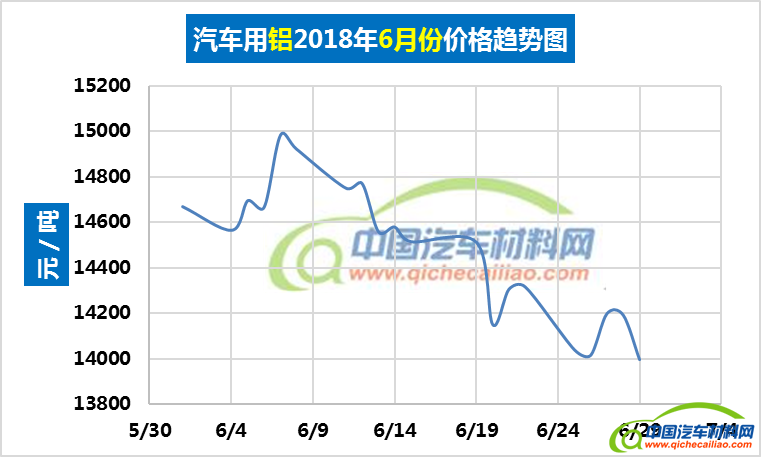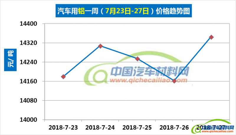 汽车用铝本周内价格变化如下:7月23日-24日,价格上涨,涨幅为128元/吨;7月24-26日价格下跌,跌幅为145元/吨;7月26-27日,价格再次上涨。汽车用铝本周均价为14250元/吨,较上周上涨1.91%,较6月份均价下跌1.51%。