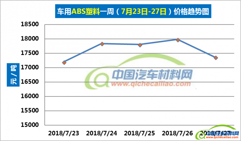 ABS塑料本周价格总体呈先上涨后下跌趋势:7月23-26日,价格上涨,涨幅为782.53元/吨;7月26-27日,价格下跌,跌幅为625.01元/吨。车用ABS塑料本周均价为17635.78元/吨,较上周上涨0.27%,较6月份均价上涨8.15%。