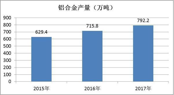 发布时间:2018-08-14 09:30:05,阅读次数:761 - 除建筑、交通和电子电力3大下游需求外,机械设备、耐用品、包装和其他4个行业合计占铝需求的25%。机械设备用铝材广泛应用于纺织机械、医疗器械、仪器仪表和模具,铝在耐用消费品行业的应用主要集中在空调、冰箱等家用电器等,其他包括炊具、家具、照明灯具、以及玩具等。包装行业的应用主要是食品饮料(用铝量占包装用铝的75%以上)、卷烟、药品包装等。此外,其他行业用铝材包括印刷、炼钢、箱包、五金及其他工业品等。预计这4个行业需求将保持7%左右的复合增长。2015年中国铝合金产量为629.4万吨,2017年中国铝合金产量为792.2万吨,较2016年同期对比增长10.7%。图1:2015-2017年铸造铝合金行业产量分析
