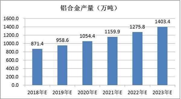 数据来源:中研普华产业研究院从2018年上半年情况看,尽管当前对原铝消费预期总体向好,但内需增长动能的可持续性仍有待观察。同时,铝材出口面临较大压力。随着金融行业监管日趋严厉,银行信贷规模不断收缩,未来中小型铝企业及贸易商的资金流动性将面临较大压力。预计全年中国市场原铝消费量为3760万吨,增速6.0%,比2017年下降2个百分点,市场总体过剩。总体看,2018年上半年高库存、需求不及预期以及成本下行等因素叠加,铝价面临较大下跌风险;随着市场供需向紧平衡格局趋近,下半年铝价有望逐步回暖。目前我国重点铸造铝合金企业面临的困境主要有:一是产品同质化现象严重,品牌认知度不够。二是产业结构不合理,总体产能有所过剩。针对面临的困境,铸造铝合金企业应当积极应对,缩短对应市场变化的反应周期:提升质量和缩短交货期,降低以成本并获取更多的订单。如何集中公司有限的力量投入到研发中去,是个大课题;优化技术攻关、科研、新品开发管理,解决存在于现在管理和创新开发流程中的问题。高强度、高韧度的可热处理强化铝合金中厚板材在我国不论是对材料的特性机理等研制开发,还是对热塑性加工工艺的应用均处于起步阶段,同国外发达国家相比有着较大的差距。因而,导致目前我国应用于航空航天、舰船制造业、高精度模具材料、高端电子等工业所需的中厚板材几乎全部依赖进口解决。未来五年,国内铝合金板用量按行业来看,预计高铁100万吨,航天100万吨,军工200万吨,汽车300万吨,城市建设80万吨。图2:2018-2023年全国铝合金产量预测