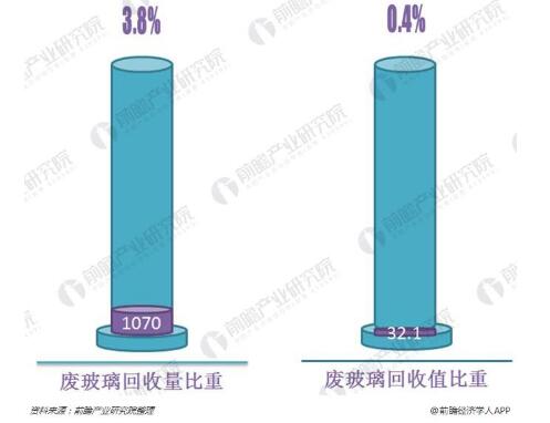 以废玻璃为例,2017年废玻璃回收量为1070万吨,占回收总量的比重为3.8%;回收值为32.1亿元,占回收总值的比重为0.4%。图表2:2017年废玻璃在再生资源回收量与回收值中的比重(单位:%)