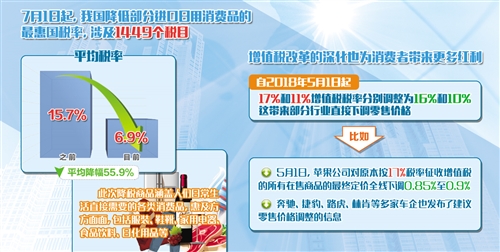 放水养鱼,给实体经济带来了显著红利;减税降费,为企业消费者送去真金白银,实乃一举多赢。应该看到,一系列减税降费措施加速落地,与中国经济稳中向好的基本面是分不开的。专家表示,要从减税降费的决心和力度中,看到中国经济稳中向好的“颜值”和“气质”,看到中国经济行稳致远的信心和底气—— 降低部分日用消费品进口关税;降低汽车整车及零部件进口关税;降低国家重大水利工程建设基金征收标准……从7月1日起,一系列减税降费措施将正式施行。 多位专家表示,这些措施再加上今年上半年开始实施的其他措施,特别是5月1日起生效的降低增值税税率等深化增值税改革政策,我国今年减税降费正进入高潮,效果将加速显现。 减税红包加速发放 从7月1日起,我国降低部分进口日用消费品的最惠国税率,涉及1449个税目。平均税率由15.7%降为6.9%,平均降幅55.9%。据财政部关税司相关负责人介绍,此次降税商品涵盖人们日常生活直接需要的各类消费品,惠及方方面面,包括服装、鞋靴、家用电器、食品饮料、日化用品,等等。降低关税在一定程度上降低了进口成本,总体上有助于降低国内市场价格。 与此同时,从7月1日起,我国降低汽车整车及零部件进口关税。“我们旨在通过降低进口关税促进汽车产业加强竞争,引导汽车产业提质增效。我们希望通过降税能促使汽车价格下降,让消费者得到更多实惠。”国务院关税税则委员会办公室有关负责人表示。 全国政协常委、资深注册会计师张连起告诉记者,“降低汽车进口关税、较大范围下调日用消费品进口关税,能够更好地满足大众多样化消费需求。这些更直接面向消费层面的减税措施,除了让公众更深切地感知减税红利外,还能进一步释放消费在推动我国经济稳、新、活、优等方面的作用,倒逼国内相关产业进一步转型升级。” 增值税改革的深化也为消费者带来更多红利。自2018年5月1日起,17%和11%增值税税率分别调整为16%和10%。这部分行业直接下调了零售价格。比如,5月1日,苹果公司对原本按17%税率征收增值税的所有在售商品最终定价全线下调0.85%至0.9%。奔驰、捷豹、路虎、林肯等多家车企也发布了建议零售价格调整的信息。 据青岛苏宁财务负责人刘玮介绍,他们今年“五一”促销期间超过70%的家电及数码产品折扣力度大于往年,销售额也创新高,这都与税率降低是分不开的。此外,部分商业零售企业也表示,税率改革后,随着价格调整从上游生产企业逐步传导至销售企业,产品销售价格也会有不同程度的下降。 降低税费给力实体 从今年5月1日起,增值税三项改革措施开始实施,包括降低增值税税率、增值税小规模纳税人扩围、对部分企业在一定时期内未抵扣完的进项税额予以一次性退还,全年减税规模将达4000亿元。 最近,各企业纷纷算起了自己的“减税账”。中国铁路工程集团财务部副部长李静表示,增值税税率下调1个百分点后,适用一般计税方法的建筑项目税负必然下降,并带动企业整体税负下降。以毛利率12%、净利率2%,原适用17%、11%税率,采购成本占成本总额47%的项目为例,税率下调后增值税税负降低近五分之一。中国建筑集团按照2017年含税合同价初步测算,税率调整后,应缴增值税将下降17.2%。中国冶金工业集团分析,2018年应缴增值税预计减少0.9亿元。 “增值税是我国第一大税种,此次增值税改革带给实体经济企业的减负作用非常明显。”中国财政科学研究院院长刘尚希说,改革实施近两个月来,实体经济受益明显,尤其是增值税税率降低,为实体经济企业带来了真金白银。 清理规范涉企收费也取得明显效果。今年清理规范的范围不仅包括行政事业性收费、政府性基金项目、经营服务性收费,还涉及基本养老保险、失业保险、工伤保险、住房公积金,以及工程建设领域保证金等方面。统计显示,前5个月非税收入9840亿元,同比下降9.5%。 从7月1日起,天使投资个人采取股权投资方式直接投资于初创科技型企业满2年的,可以按照投资额的70%抵扣转让该初创科技型企业股权取得的应纳税所得额;当期不足抵扣的,可以在以后取得转让该初创科技型企业股权的应纳税所得额时结转抵扣。业内人士认为,此举将进一步推动股权投资支持实体经济,引导更多资金投向早期科技项目,激发产业创新。 此外,为促进甩挂运输发展,提高物流效率和降低物流成本,财政部、国家税务总局、工业和信息化部等三部门联合发布公告明确,自2018年7月1日至2021年6月30日,对购置挂车减半征收车辆购置税。专家认为,挂车是物流货品承运的主要工具之一,挂车购置税减半可以为企业较大幅度节约车辆采购成本,从而降低整体运营成本。 经济越稳力度越大 今年《政府工作报告》提出,全年再为企业和个人减税8000多亿元,全年要为市场主体减轻非税负担3000多亿元。截至目前,绝大多数减税降费措施已经出台,今年的超万亿元减税降费“红包”将在下半年加速落袋,改革红利将更充分地被企业和个人感知。 近几年,我国新设立市场主体不断增加,税基不断扩大。比如,2017年全国新登记企业比上年增长9.9%,日均新登记企业1.66万户。“此外,通过深入推进‘三去一降一补’等措施,企业盈利面扩大。伴随着财政收入稳步增长,我国减税降费的决心和力度也更大。”张连起说,从长周期看,减税可以“放水养鱼”,扩大税基,增强发展后劲。我们