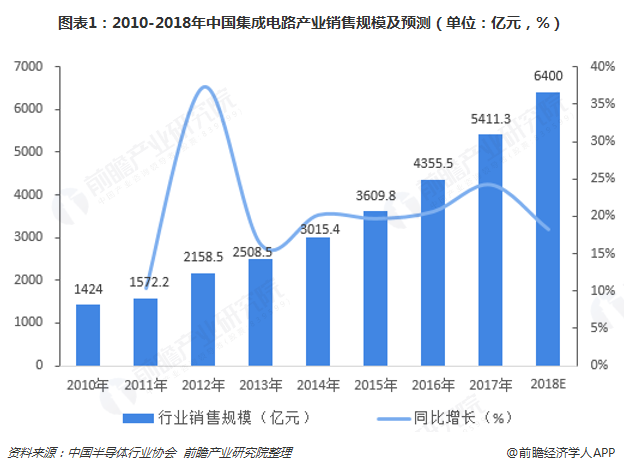 发布时间:2018-12-25 09:34:52,阅读次数:394 - 集成电路(integrated circuit)是一种微型电子器件或部件,它采用一定的工艺,把一个电路中所需的晶体管、电阻、电容和电感等元件及布线互连一起,制作在一小块或几小块半导体晶片或介质基片上,然后封装在一个管壳内,成为具有所需电路功能的微型结构。由于几乎所有的电子设备中都需要使用集成电路,因此集成电路已经广泛应用到计算机、家用电器、数码电子、自动化、电气、通信、交通、医疗、航空航天等诸多国家重要领域。作为信息技术产业的核心,集成电路已逐渐成为衡量一个国家或地区综合竞争力的重要标志和地区经济的晴雨表,成为支撑经济社会发展和保障国家安全的战略性、基础性和先导性产业。近年来,在国家政策扶持以及市场应用带动下,我国集成电路产业保持快速增长,持续保持了增速全球领先的势头。根据中国半导体行业协会数据显示,2010年我国集成电路产业销售规模仅为1424亿元,2017年上升至5411.3亿元,较2010年增长了2.8倍,2010-2017年复合增长率达21.0%。2018年前三季度,全国集成电路产业销售规模为4461.5亿元,同比增长22.4%,预计2018年全年行业销售规模将达6400亿元,持续保持两位数增长。