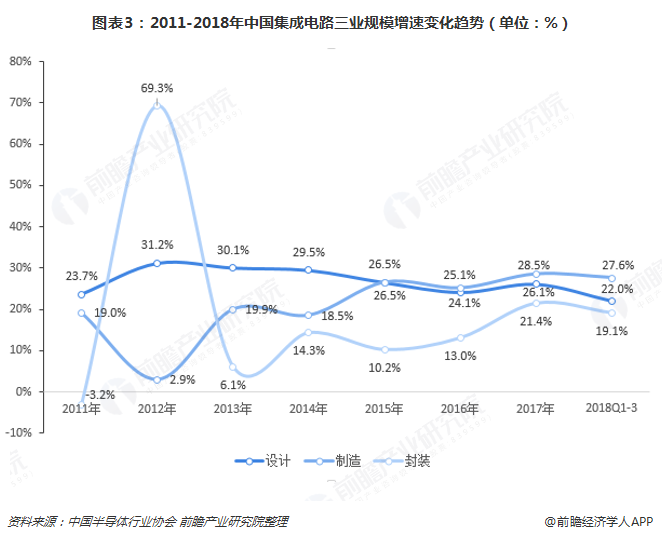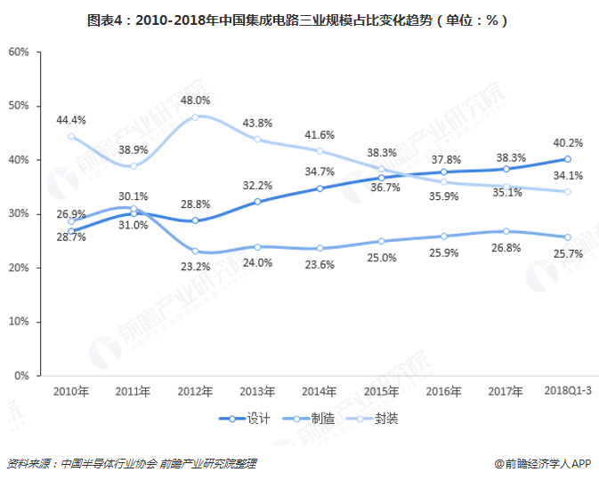 集成电路设计成最大细分市场,2018年前三季度占比达40.15%一条完整的集成电路产业链除了集成电路设备制造和关键材料生产等上游支撑产业、下游需要行业外,集成电路产业本身还包括设计、制造、封测三个子产业。近年来,在集成电路行业整体规模得到较大扩张的同时,也推动了三业的共同发展。从规模来看,具体如下:集成电路设计业:2010年全国集成电路设计业销售规模仅为383.0亿元,占整个行业比重为26.9%;2017年集成电路设计业销售规模上升至2073.5亿元,占比38.3%;2018年前三季度,占比进一步上升至40.2%。集成电路制造业:集成电路制造即ic晶圆制造,2010年以来,尽管集成电路制造业占比总体呈下降趋势,由2010年的28.7%,下降至25.7%,但从集成电路制造业规模增速来看,超过了设计和封装业,2016、2017、2018年前三季度增速分别达到了25.1%、28.5%和27.6%,高于行业整体增速。集成电路封装业:2010年国内集成电路测试封装业销售规模为632.0亿元,占比44.4%;2017年销售规模上升至1899.7亿元,占比下降至35.1%,2018年前三季度续降至34.1%。