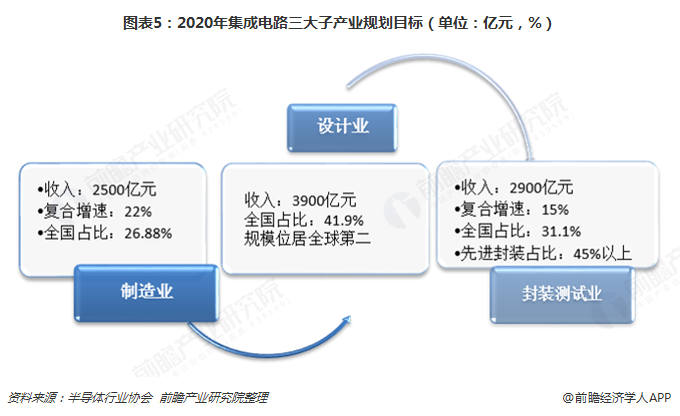 政策支持集成电路发展 行业将持续保持高速增长为促进集成电路的进一步发展,2016年11月,中国半导体行业协会发布《中国半导体产业“十三五”发展规划》,《规划》在重点突出集成电路产业的基础上,提出如下发展目标:2020年,全国集成电路设计业年销售收入将达到3900亿元,年复合增长率为25.9%;产业规模占全国集成电路产业比例为41.9%,我国的集成电路设计产业规模将位居全球第二。2020年,集成电路晶圆制造产业销售额达到2500亿元,年复合增长率达到22%,产业规模占全国集成电路产业比例为26.88%。2020年,集成电路封测业销售收入达到2900亿元,年复合增长率达到15%。产业规模占全国集成电路产业31.1%,先进封装销售收入占封测业总销售收入比例目标为45%以上。从行业协会对集成电路的规划来看,我国集成电路行业未来有望保持持续高速增长。