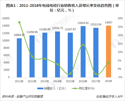 发布时间:2018-12-29 08:57:41,阅读次数:365 - 行业的发展推动了电力输配、电能传输等行业的发展,随着我国电力、数据通信、城市轨道交通等行业的发展,有增加了对电线电缆的产品需求,促进了该行业规模的提升。国家统计局统计数据显示,至2017年我国电线电缆行业规模以上企业达到4034家,受国家调整过剩产能的影响,企业数量较2016年减少30家。但是从行业的整体规模情况看,2011-2017年中国电线电缆行业销售收入总体波动上升,行业年均复合增长率为4.02%。至2017年行业销售收入为13513.04亿元,同比下降2.95%。随着我国电线电缆行业的调整进入深化发展期,其过剩、劣质产能的淘汰虽然会对行业的整体市场规模有一定的影响,但是产品逐渐由向转变,在国内相关产业发展及对外一带一路发展战略的促进下,2018年我国电线电缆行业的销售收入实现继续小幅增加,超过14000亿元。