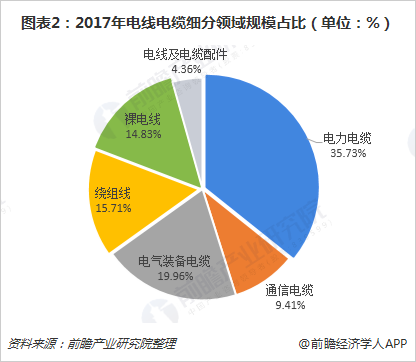 图表1:2011-2018年电线电缆行业销售收入及增长率变化趋势图(单位:亿元,%)电线电缆行业产品主要分为电力电缆、电器装备电缆、绕组线、裸电线和通信电缆几大类,由于电力电缆的应用范围较广泛,该产品的收入规模占比较大。2017年电力电缆产品收入规模达到4827.66亿元,较上年同比下降2.35个百分点,受行业总规模下降的影响,各细分领域规模均有所下降,以通信电缆下降比重最大,达到3.7%。从细分产品来看,电力电缆仍是行业重要的细分领域,2017年电力电缆产量达到4933.60万公里,当年通信电缆的产量在5500万对千米左右,2017年电气装备电缆的年产值达到3160.39亿元。