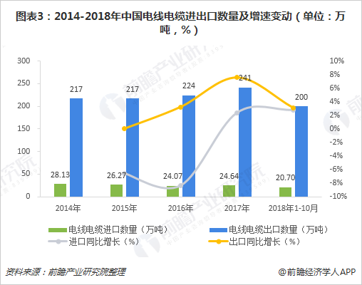 图表2:2017年电线电缆细分领域规模占比(单位:%)出口能力稳定提升,进口产品单价较高截止目前,我国是全球电线电缆重要的生产国,国内电线电缆生产能力维持了我国电线电缆出口能力的稳定。据统计,2014-2017年我国电线电缆的出口数量稳定增加,至2017年电线电缆出口数量达到241万吨,较上年增加17万吨,至2018年十月我国电线电缆的出口量为200万吨,较上年同比增加3.09%,预计2018年全年基本维持上年的发展。从国内电线电缆的进口来看,随着我国产品供应生产能力的提升,对国外电线电缆的进口数量小幅下降,至2018年共进口电线电缆20.7吨。