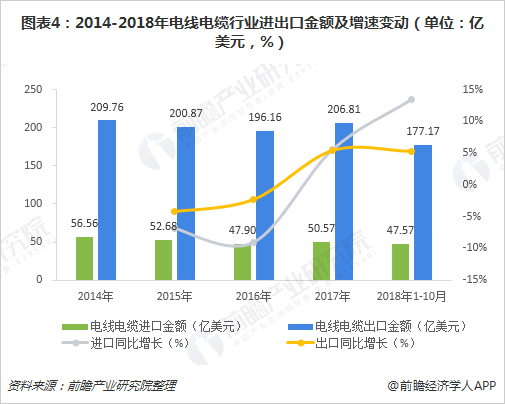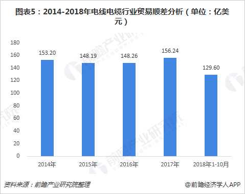 图表4:2014-2018年电线电缆行业进出口金额及增速变动(单位:亿美元,%)贸易顺差继续加大,2019年维稳提升近年来,随着我国电线电缆生产能力的提升,产品的出口数量不断增加,我国该行业的发展一直呈现贸易顺差的发展状态,2014-2017年国内电线电缆行业的贸易顺差一直在140亿美元以上,顺差规模较大。2018年至10月,电线电缆的贸易顺差达到129.6亿美元。我国制造业在经历了调结构、去产能等的促进,电线电缆行业得到了较为规范的发展,预计2019年我国电线电缆生产企业的收购、兼并、充足的现象将会增加,促进行业的集中度不断提高,同时也推动国内电线电缆行业的转型升级发展。