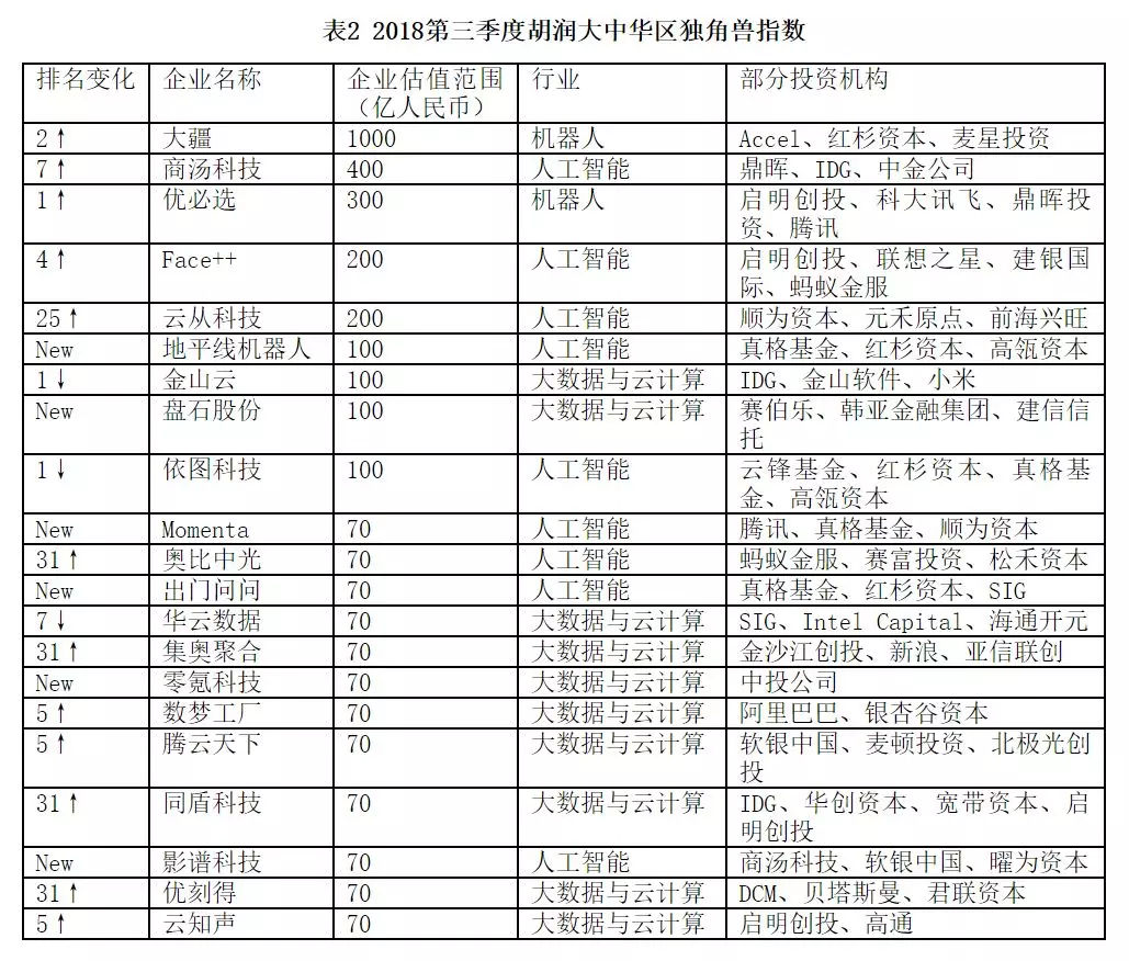 注:1. 其中,第三季度新上榜的有估值100亿人民币的地平线机器人(人工智能)、盘石股份(大数据与云计算),估值70亿人民币的momenta(人工智能)、零氪科技(大数据与云计算)、出门问问(人工智能)、影谱科技(人工智能)。2. 数据来源于胡润研究院等机构。