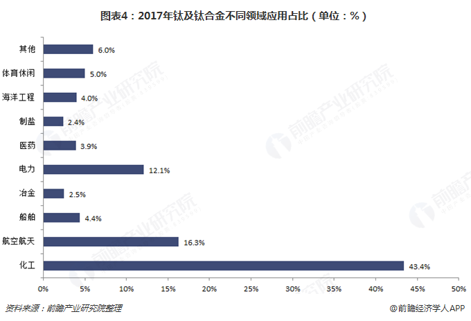 钛产品应用于国民经济多个重要部门,如化工、电力、、冶金等领域,不过钛制品需求结构在地区上存在明显差异。在拥有发达的航空航天和军工国防工业的北美和欧盟地区,尤其是美国,大约50%以上的钛制品需求来自于航空航天和军工国防领域。而在日本,来自化工等行业的工业用钛占据了需求的主导地位。我国钛制品需求大部分来自化工和能源领域,航空航天只占到10%。虽说中国已成为全球最大的钛金属生产国和消费国之一,不过大部分生产一直局限于等级较低的钛,用于自行车架、高尔夫球杆或使用的防腐管材。 但是近年来航空航天用钛量在亚洲地区出现明显增长。2017年,我国钛及钛合金化工领域的应用量为23948吨,占比达到43.4%。
