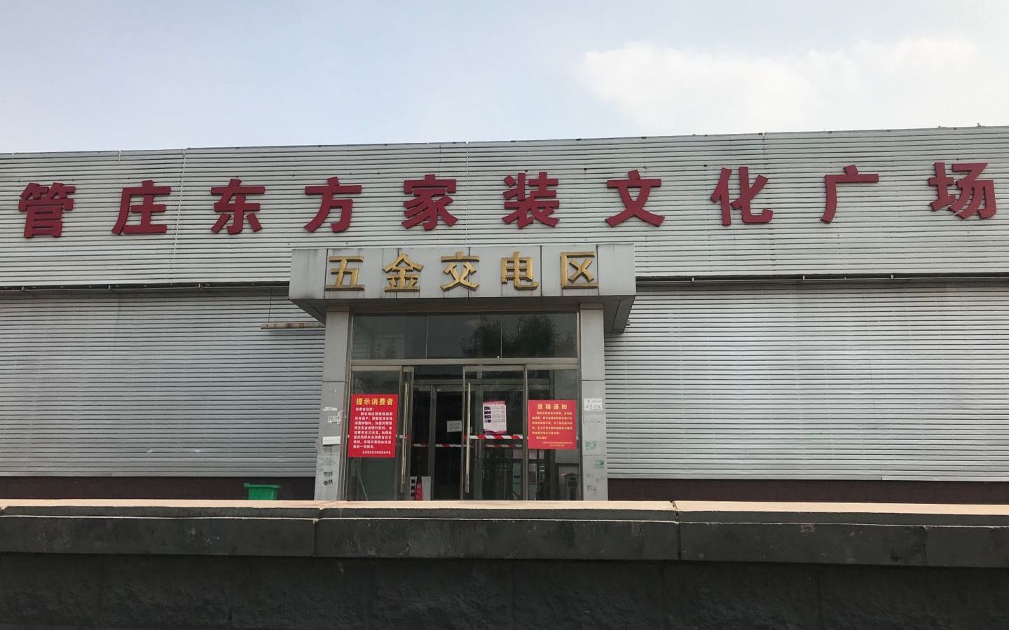 大厅里商户已搬空,门口贴着退租通知和消费提示。新京报记者 陈琳 摄门口的保安告诉记者,商户基本在5月15日就全部撤离,目前还有一部分商户未办理退租手续。旁边还贴了一张针对消费者的提示:因市场近期疏解所有商户,顾客在本市场消费购物时,如遇到需要预交定金或预付款的,由消费者自己决定,如因此造成损失由消费者自己承担,市场不承担由此造成的一切损失。部分商户搬到对面刨花板市场继续经营从贴出公告到清退完毕,用时仅半个月。记者前去采访时,仍有部分商户守在铁门外,一看记者过来就询问,“想买点什么?”在东方建材批发市场对面,是朝阳路北侧的管庄刨花板市场,比东方建材批发市场更早,1992年就开业了。以前这里全是卖板材的,后来进行了升级改造,重新装修升级后,商户经营的品类也齐全了。一位经营瓷砖的商户说,刨花板市场的经营范围以灯具、五金和各类品牌建材为主。“今年4月底,东方建材批发市场贴出停业通知,要求我们在半个月内完成搬家。”这位商户说,他已经将商铺搬到了刨花板市场的二楼,但怕有客户找不到,所以最近他都会在门口守着。