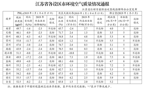 发布时间:2019-06-18 07:18:52,阅读次数:450 今天,省打好污染防治攻坚战指挥部办公室继续发布各设区市环境空气质量情况通报(详见表)。通报显示,1月1日-6月15日,对照2019年各设区市环境空气质量改善约束性目标,13个设区市中,无锡、常州、苏州、南通、淮安、盐城、镇江、泰州和宿迁9市PM2.5浓度降幅达标,其他4市PM2.5浓度降幅未达标;无锡、徐州、苏州、南通、淮安、泰州和宿迁7市优良天数比率升幅达标,其他6市优良天数比率升幅未达标。