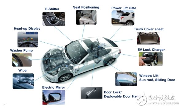 市场趋势预估车用直流马达系统的需求将稳定成长,未来5年的年成长率约在3.1%左右。车身周边的需求主要来于自车门、电动后照镜、座椅调整、清洁剂帮浦、雨刷、车窗开关、天窗和电动滑门等传统应用。但还有许多新崛起且十分吸引消费者的应用逐渐面市,部分实例包括抬头显示器(hud)、隐藏式车门把手、电动尾门、电动车换档切换器和电动车充电器锁。