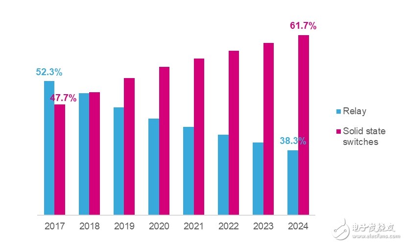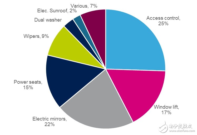 考虑以上状况,估计2020年全球各地与车身相关的车用直流马达需求将达到20亿个。下图为各种应用所占比例,所有应用耗电都在30w到200w之间。在车身应用上驱动直流马达使用和内建芯片的比较过去汽车产业一直将继电器视为一种简单又便宜的解决方案,用来驱动直流马达。但这种想法正逐渐改变,现在汽车商认为ssd才是更适合新应用设计的选择。ssd因为具有高度可靠的质量且诊断功能更为强化,很容易就能建置各种创新功能,像是驱动各种可变负载配置文件(例如电动尾门)或控制动作的顺畅度(例如车窗开关或座位调整)、消除继电器开关噪音以及增加豪华感。最重要的是,全世界的地方立法机构已开始针对汽车的物质和二碳排放设定新的限制,汽车结构必须有所调整,尤其是动力负载的供应,皆必须采用效率更高的电子组件。虽然新标准的冲击对象将以动力总成(power-trn)系统为主,车身控制模块(body control module,bcm)还是有一部分关联性。因此我们预测,2020-2025年间由ssd驱动的直流马达每年平均成长6.7%,逐渐抢攻继电器的市占率。