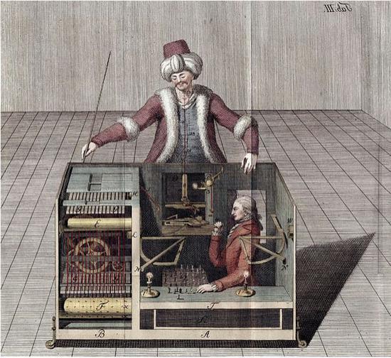 此话的确是入木三分,因为自古至今,人类一直有成为上帝的欲望——即创造人类。在古希腊神话中,赛浦路斯国王皮格马利翁是一位有名的雕塑家,当他用心雕塑了一座美少女雕像后,竟然爱上了这座雕像。其感情之真挚,最终打动了爱神阿芙洛狄忒,并赐予了雕像生命,让他们结为夫妻。心理学著名的 " 皮格马利翁效应 " 正源于此 : 期望和赞美能产生奇迹。而在中国古代,同样有 " 偃师献技 " 的传说。神乎其技的偃师,用一个以各种材料打造而成的假人,竟达到了真人演出的效果,更是骗过了整个皇宫,最后令周穆王大为惊讶。真实的历史中,同样发生过类似的事情。18 世纪晚期时,奥地利的肯佩伦为了取悦贵族,做了一个看似土耳其人偶状的自动下棋装置。这个 " 土耳其行棋傀儡 " 可以和人类下棋,并且棋力不低,击败了同时代很多名人。更神奇的是,这个机器还能解数学题,以及用不同语言回答人类的问题。据不完全统计,与这个 " 土耳其行棋傀儡 " 下过棋的名人,包括法国皇帝拿破仑 · 波拿巴、美国开国元勋本杰明 · 富兰克林、奥地利大公、俄罗斯皇帝、以及著名美国作家爱伦 · 坡。然而,这个机器其实完全是个骗局,真相是在机器中藏了一个下棋高手,再通过磁铁和杠杆等装置,假装成是人偶操作。这个骗局最终横行了大西洋两岸各国长达 84 年。