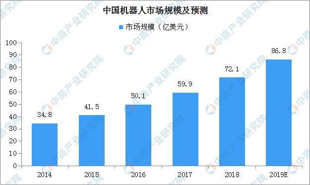 数据来源:中商产业研究院大数据库我国服务机器人的智能水平快速提升,已与国际第一梯队实现并跑。到2021年,随着停车机器人、超市机器人等新兴应用场景机器人的快速发展,我国服务机器人市场规模有望接近40亿美元。特种机器人研究实力基本能够达到国际先进水平,应用场景范围不断扩展,尤其是在应对地震、洪涝灾害和极端天气,以及矿难、火灾、安防等公共安全事件中,对特种机器人有突出的需求。目前,我国的特种机器人部分关键核心技术取得突破,无人机、水下机器人等领域形成了规模化产品。中国机器人市场规模巨大当前,中国机器人产业优势明显,竞争力不断加强,产业规模持续扩大。预计2019年中国机器人市场规模将达86.8亿美元。其中,工业机器人市场规模约为57.3亿美元,服务机器人市场规模约为22亿美元,特种机器人市场规模约为7.5亿美元。