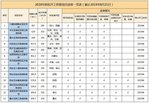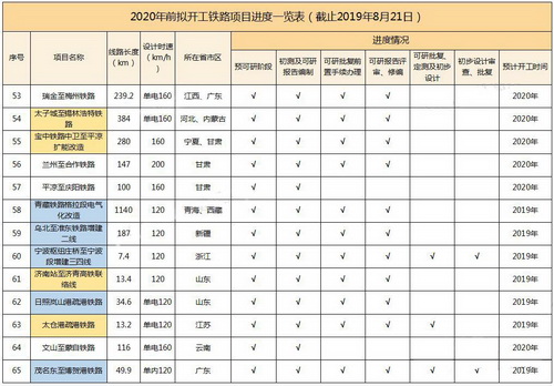 说明01、可研批复前置手续办理内容主要包括:规划选址意见报告、用地预审报告、环评报告、水土保持报告、地质灾害评估报告、行洪评价报告、社会稳定性风险报告、专题设计报告等,并完成可研报告咨询评估。02、预可研阶段的内容主要包括:勘查设计招标、预可研地质勘察及预可研文件编制、审查。03、由于铁路建设项目不确定影响因素较多,预计开工时间仅作参考;对于非全线一次性开工项目,以先期段或控制性工程开工为准。04、对于2019年计划开工项目,预计年内会全部完成可研批复及初步设计审批,并加快施工图设计及建设准备工作,确保年内开工建设。05、部分规划线路里程仅供参考,本表将会根据各项目进度情况不定期更新。06、初步设计批复后,即可以进行施工图设计并具备施工招标条件。07、上图中蓝色部分为国铁集团2019年计划开工项目、黄色部分为2019年储备开工项目;其中前六项均为国铁集团主导并出资为主(出资五成及以上)的国家干线铁路,年内预计会逐一批复可研。08、新建项目总里程约1.4万公里,改扩建项目总里程约2000公里。