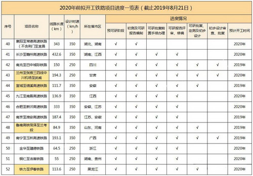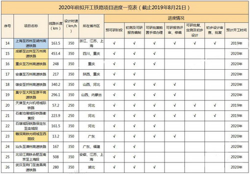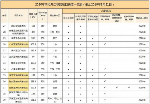 09、与7月25日版本相比,变化如下:(1)天津至潍坊和潍坊至烟台合并为一个项目,可研评审已于8月17日完成;(2)长赣高铁可研评审已于7月31日完成,;渝万高铁可研评审已于7月4日完成;(3)池黄高铁初步设计已获批;(4)修正部分线路里程,北沿江高铁上海至合肥段已进入线路初测,新建线路长度为508公里(其中上海段52公里,江苏段370公里,安徽段86公里);根据7月底广湛高铁环评报批稿,正线长度为400.1公里,新建佛山、新干线机场、新兴南、阳春东、阳江北、茂名南、湛江北站,并站新建马踏、吴川站,接轨白云、广州、湛江西站,预留阳西、湛江东站;(5)8月初,中国国家铁路集团有限公司与江苏省人民政府联合发文《关于新建太仓港疏港铁路专用线工程可行性研究报告的批复》(铁发改函〔2019〕104号),同意新建太仓港疏港铁路专用线工程。根据可行性研究批复,本项目为铁路专用线单线,自沪通铁路太仓港站上海端引出,向东至浪港河南侧设浮桥集装箱装卸作业区。正线全长约13.2公里,新建太仓港站上行疏解线2.24公里,总投资18.87亿元,建设工期1.5年。(6)新增项目:①巢马城际铁路:可研已完成修编、二次环评已公示;②天津至北京大兴机场城际铁路一期(胜芳至固安东)、二期(固安东至京冀省界),一期已开始施工图审核招标;③石衡沧港城际铁路:初步设计已批复,已进入施工图审核阶段;④石雄城际铁路:已进入可研批复前置手续办理阶段;⑤宁波至舟山(甬舟)铁路:已完成可行性研究报告专家评估。