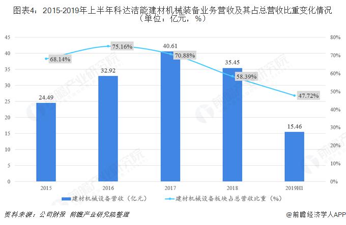 龙头科达洁能:出口渗透率保持上升,技术实现标志性突破科达洁能是建筑陶瓷机械领先企业,是国内唯一一家能够提供建筑陶瓷整厂整线设备的厂家,核心产品在国内市场占有率遥遥领先。根据公司历年财报数据,建材机械装备是公司营收主要来源,2018年公司建材机械装备业务实现营收35.45亿元,占总营收58.39%。近年来公司谋求从设备提供商向产业服务商的转型新发展,自2016年开始,在海外向下游建筑陶瓷行业进一步延伸,布局发展中国家的瓷砖市场。另外,受新能源汽车行业迅猛发展和消费电子行业稳定增长的驱动,公司锂电材料市场迅速扩张。因此,从下图可见,2017年开始公司的建材机械装备业务收入占总营收比重逐年下降,公司的营收渠道趋于多元、收入结构趋于合理。