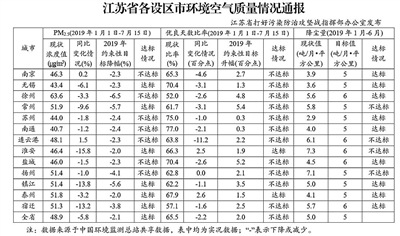 省打好污染防治攻坚战指挥部办公室发布各设区市环境空气质量情况通报(详见上表)。通报显示,1月1日—7月15日,对照2019年各设区市环境空气质量改善约束性目标,13个设区市中,无锡、常州、淮安、镇江、泰州和宿迁6市PM2.5浓度降幅达标,其他7市PM2.5浓度降幅未达标;淮安、泰州2市优良天数比率升幅达标,其他11市优良天数比率升幅未达标。