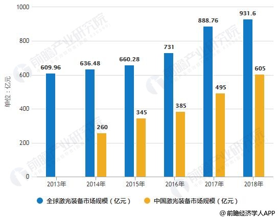 数据来源:前瞻产业研究院整理4)对于工业激光设备,早在2015年,中国就取代欧洲首次成为激光器最大的消费市场,约占全球市场规模的29%,据统计,2018年中国激光装备市场规模为605亿元,超过全球市场的一半。不过,激光装备竞争格局较为分散。2013-2018年全球与中国激光装备市场规模对比情况