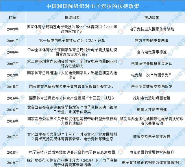 资料来源:中商产业研究院整理二、政策扶持推动行业发展电竞产业的蓬勃发展态势也引起了国家相关部门的重视,包括文化部、体育部以及教育部等相继出台电竞产业相关政策为行业的发展提供规范引导。2017年10月31日,国际奥委会正式宣布,认证电子竞技运动为正式体育项目,代表着国际奥委会将开始把电子竞技纳入奥运会比赛项目,并正在考虑是否纳入2024年巴黎奥运会。2018年,电子竞技正式成为雅加达亚运会的电子体育表演项目,至此,电子竞技在国家体育战略中取得了与传统体育项目相同的地位。随着电子竞技进入高速发展期,人们对电子街竞技的关注度也不断提升,电子竞技或将迎来“春天”。