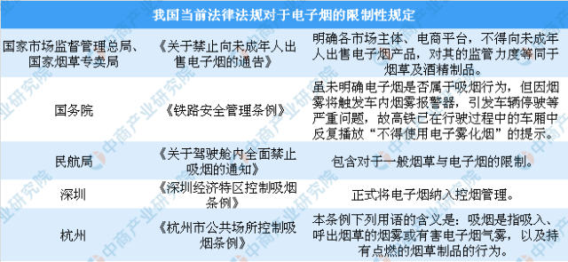 数据来源:中商产业研究院整理随着市场不断扩大,电子烟行业规范的不足逐渐显露。近几年,国家和地方政府对电子烟监管趋于严格。国家层面发文禁止向未成年人出售电子烟产品。地方政府对于电子烟也是多方限制,除深圳外,杭州将电子烟与一般烟草纳入统一控烟管控。民航局发文驾驶舱禁止吸电子烟。高铁虽未明令禁止,但是反复播放“不得使用电子雾化烟”的提示。