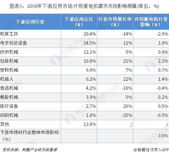 发布时间:2019-10-30 07:51:30,阅读次数:427 - 近年来,中国制造业整体景气度下行;2019年8月,中国规模以上工业产值同比增长4.4%,环比下降0.4个百分点。伺服电机是实现智能制造业的核心装备之一,市场规模受下游景气程度影响,市场增速出现较大滑落。1、伺服电机下游市场分析2018年,伺服电机的下游应用市场包括机床工具(20.4%)、电子制造设备(14.5%)、纺织机械(12.1%)、包装机械(10.8%)、(6.2%)等。