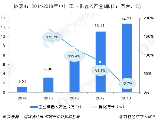 2018年,机床工具市场、食品机械市场、印刷机械市场均出现下滑。根据机经网数据,2018年,中国数控金属切削机床产量为19.06万台,同比下降14.53%;2018年,中国印刷产量为19253.68吨,同比下降25.1%。机器人、包装机械及医疗设备市场则保持较快增长,带动伺服电机需求市场增长。根据国家统计局数据,2018年,中国工业机器人产量为14.77万台,同比增长12.7%,根据中国电子学会数据,2018年中国服务机器人市场增长约为43.9%,2018年整体机器人市场增速在22%左右。