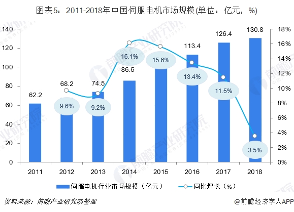 2、中国伺服电机市场有望维系较快增长通过测算,2018年,下游市场需求对伺服电机市场增长贡献率为3.5%左右,按此增速,2018年,中国伺服电机的市场规模为130.8亿元。综合来看,尽管受经济增速放缓,制造业景气度下滑影响,伺服电机市场增速有所放缓,但从产业长期发展趋势来看,随着控制系统灵活度上升,智能制造替代人工的刚性需求,未来驱动、控制的比例将逐渐提升,伺服市场空间有望维系较快增长。