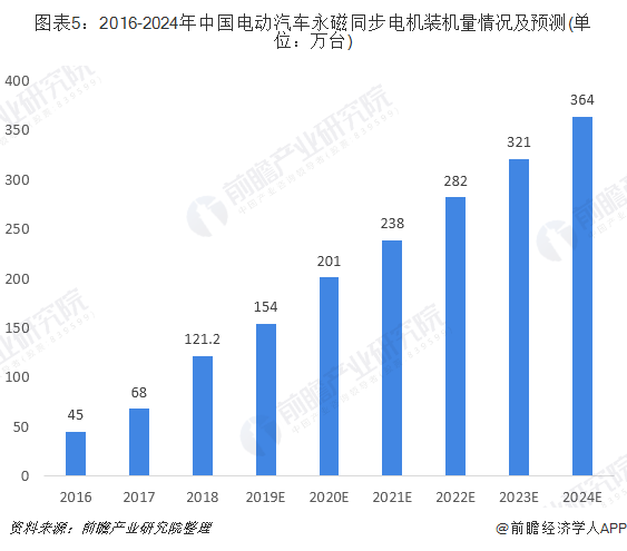 随着我国多项利好政策和技术的不断突破的推动下,我国新能源汽车呈现高速发展状态,以此可以看出我国永磁同步电机的市场需求空间巨大,前瞻结合近年来永磁同步电机的发展增速预计,到2024年,我国永磁同步电机装机量将达到364万台。
