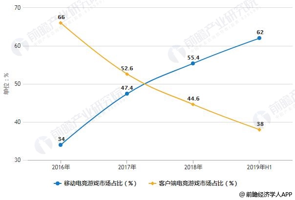 数据来源:前瞻产业研究院整理2、移动电竞游戏市场占比进一步扩大按照设备类型分析我国电竞游戏收入结构,根据伽马数据,2016-2018年我国移动电竞游戏市场规模不断扩大,移动电竞游戏销售收入占整体收入的份额从2016年的34.0%上升至2018年的55.4%,首次超过了客户端电竞游戏收入,主要得益于《王者荣耀》等移动电竞游戏产品的发展。2019年上半年,移动电竞游戏市场占比进一步扩大至62.0%。2016-2019年h1中国电子竞技游戏市场收入结构分析情况