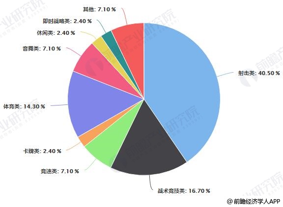 数据来源:前瞻产业研究院整理3、射击类游戏是客户端电竞游戏主要构成部分根据伽马数据,2018年在网吧热力值top100游戏中,射击类游戏是客户端电子竞技游戏市场的主要构成部分,占比达到40.5%;其次是战术竞技类游戏和体育类游戏,占比分别达到16.7%和14.3%。2018年网吧热力值top100游戏中客户端电子竞技游戏类型分布情况