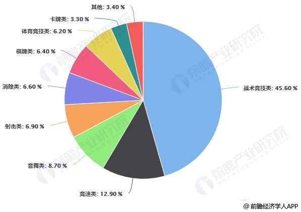 数据来源:前瞻产业研究院整理4、移动端战术竞技类游戏头部效应明显根据伽马数据,2018年从收入占比来看,战术竞技类游戏(moba类)是移动电子竞技游戏收入的重要构成,收入占比达到45.6%。战术竞技类游戏头部效应明显,在2018年收入前50的移动电子竞技游戏中,战术竞技类游戏仅有《王者荣耀》、《决战!平安京》、《非人学园》三款,其中《王者荣耀》成为该类型游戏收入的主要构成。强对抗性、强竞技性的战术竞技类游戏是用户以及赛事主办方所热衷的游戏类型,未来该类型的移动游戏数量预计会有所上升,进而提升战术竞技类游戏产品的收入。受政策调控等因素的影响,现阶段数量占比最高的棋牌类移动游戏数量可能会有所下降。2018年收入前50移动电子竞技游戏中各类型游戏收入占比统计情况