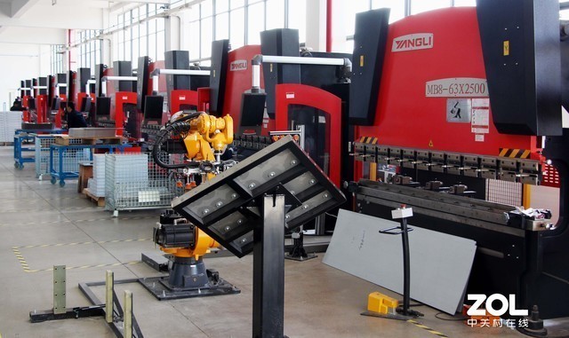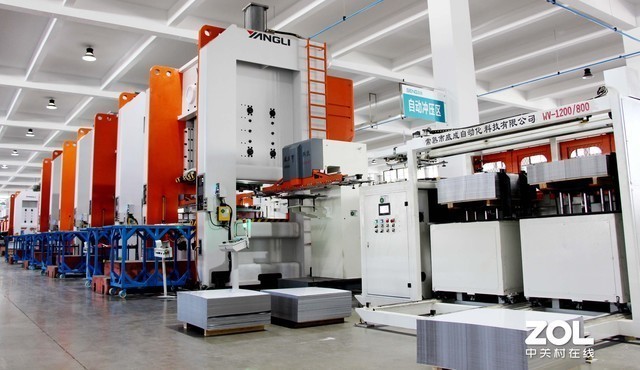 目测现场至少有四台折弯机在同时作业在蓝色的料架上摆放的就是待弯折处理的板材,虽然其中还需要人工操作,但人力也只是辅助,左侧的师傅正在调整设备参数,剩下的事情就交由机器来完成。除了弯折工艺,冲压也是集成灶生产中的一道关键工序。森歌4.0工厂引进了一套全自动冲压流水线,传统17道工序一次搞定,一套自动化生产设备效率堪比30名熟练工,这也是森歌着力打造智能化工厂的一个重要原因。