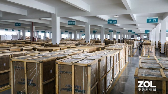 全自动塑封以及绑扎带设备包装完毕的设备可以直接被专用电梯运至仓库,或者直接送上楼下的卡车发往全国各地。笔者在森歌的仓库也看到了以省为单位区分的不同发货位置。
