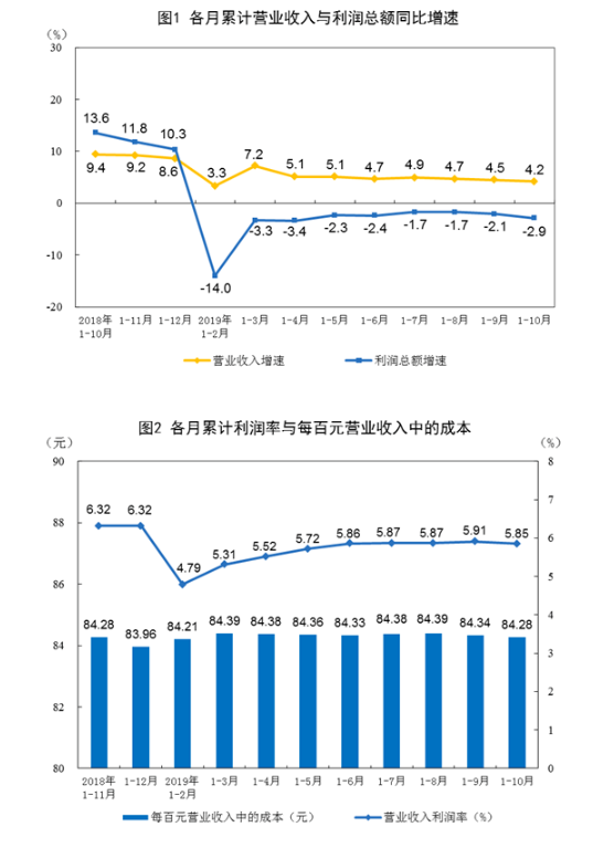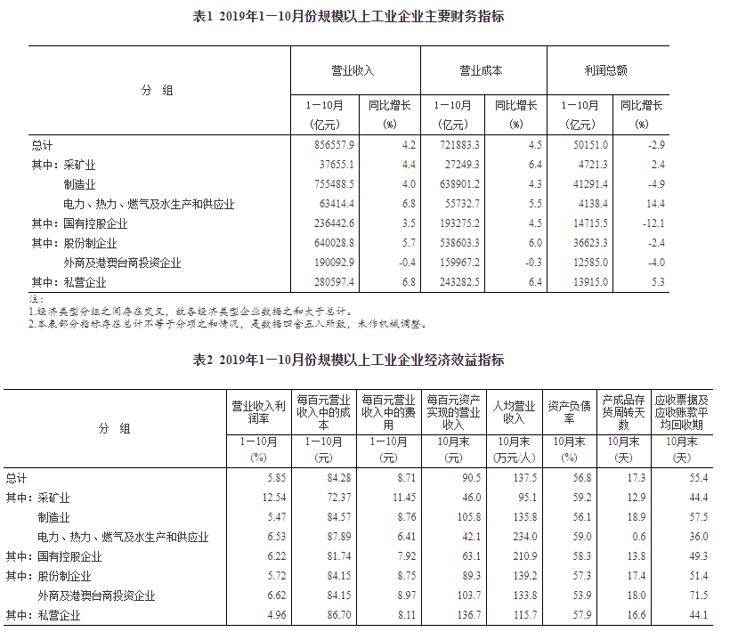 发布时间:2019-11-28 08:43:52,阅读次数:336 - 国家统计局27日公布数据显示,1-10月份,全国规模以上工业企业实现利润总额50151.0亿元,同比下降2.9%,降幅比1-9月份扩大0.8个百分点。统计局解读工业企业利润数据时称,1-10月份工业企业效益情况呈现以下特点:一是高技术制造业、战略性新兴产业和装备制造业利润增长加快。二是私营企业和小型企业利润保持稳定增长。三是外商及港澳台商投资企业利润降幅继续收窄。四是资产负债率下降。五是产成品存货周转有所加快。1-10月全国规模以上工业企业利润同比降2.9%1—10月份,全国规模以上工业企业实现利润总额50151.0亿元,同比下降2.9%(按可比口径计算,考虑统计制度规定的口径调整、统计执法增强、剔除重复数据、企业改革剥离、四经普单位清查等因素影响,详见附注四),降幅比1—9月份扩大0.8个百分点。1—10月份,规模以上工业企业中,国有控股企业实现利润总额14715.5亿元,同比下降12.1%;股份制企业实现利润总额36623.3亿元,下降2.4%;外商及港澳台商投资企业实现利润总额12585.0亿元,下降4.0%;私营企业实现利润总额13915.0亿元,增长5.3%。1—10月份,采矿业实现利润总额4721.3亿元,同比增长2.4%;制造业实现利润总额41291.4亿元,下降4.9%;电力、热力、燃气及水生产和供应业实现利润总额4138.4亿元,增长14.4%。