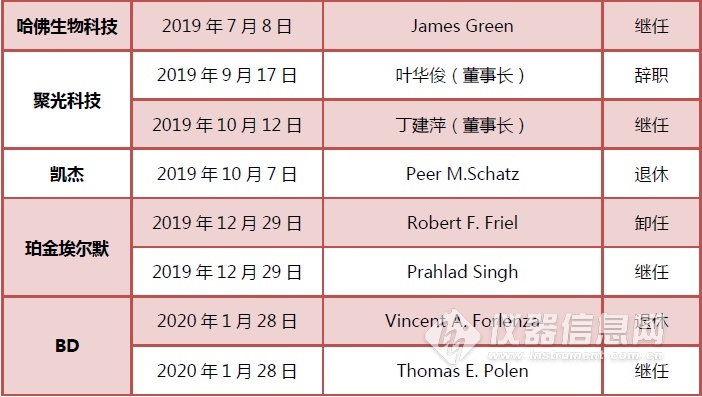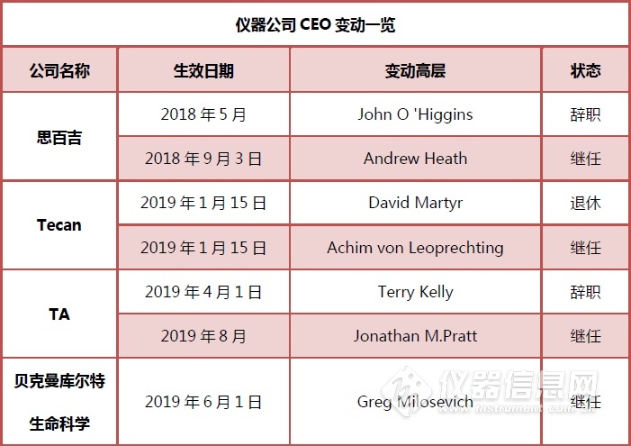 仪器信息网讯2019年,世界多个国家陷入了经济衰退泥潭,经济增长率滑落至多年低点。国际货币基金组织(imf)将2019年全球经济增长预期下调到3%,这是十年来最低的增长率,暗示接下来全球经济陷入严重衰退的可能性很大。近日,wto公布的全球贸易景气指数创2010年以来最低水平,世界银行行长david malpass也表示,全球经济前景正在恶化。贸易战、制造业萎靡、地缘政治、利润缩水等不确定因素时时刻刻在改变市场、企业及政府的信心和决策。不知出于偶然因素还是战略调整,2019年竟有多家跨国科学仪器公司发生了高层变动,大部分涉及董事长或首席执行官。仪器信息网特别奉上本期盘点,为您梳理科学仪器企业最新动向。1、思百吉思百吉集团从2018年5月爆出消息,首席执行官 john o 'higgins向董事会提出离职申请,公司同时启动了物色继任者的工作。数月后,思百吉宣布andrew heath将加入董事会,并担任ceo一职。andrew在劳斯莱斯公司拥有30年工作经验,并曾任劳斯莱斯公司能源总裁。在此之后,andrew曾短暂担任多alent plc的ceo,并在2016年至2018年,成为imagination technologies group 公司的ceo。john o 'higgins于2019年5月23日之前继续为andrew和思百吉董事会提供支持,o 'higgins本人还曾担任霍尼韦尔自动控制系统事业总部亚太区总裁。2、tecantecan集团在年初宣布,首席执行官david martyr博士在公司掌舵6年半后正式退休。david martyr在生命科学领域及分析仪器行业拥有超过20年的领导经验,任职期间将tecan销售额推向了50%以上的增长,其中约三分之二来自有机增长,主要来自产品创新和区域扩张,消耗品和试剂对收入的贡献突出。继任者achim von leoprechting博士原先供职于packard bioscience,后随着公司被并购加入珀金埃尔默。2013年加盟tecan后,带领集团合作伙伴业务平均每年增长超过9%,具备良好增长定位。3、ta沃特世今年宣布,terry kelly已于2019年4月1日辞去ta仪器总裁职务。继任者jonathan m.pratt于8月出现,被任命为沃特世公司高级副总裁兼ta仪器公司总裁。加入沃特世之前,pratt曾是贝克曼库尔特总裁,在其带领及努力下,通过经营及收购,推动了该公司有机收入和经营利润的增长。此外,他还曾在颇尔公司担任高级职位。4、贝克曼库尔特生命科学丹纳赫生命科学平台6月宣布,greg milosevich被任命为贝克曼库尔特生命科学总裁,将领导贝克曼库尔特生命科学(beckman coulter life sciences)战略,以发展业务并提升其市场领导者的地位。greg在丹纳赫任职超过10年,最近担任的职务是molecular devices总裁,并领导了idbs和fortebio业务部门的收购和整合。在领导molecular devices之前,greg曾担任molecular devices全球商业运营和western markets的副总裁兼总经理,更早之前还担任过molecular devices在美洲和新兴市场的销售领导职务。5、哈佛生物科技哈佛生物科技公司于7月8日宣布,任命james green为公司总裁兼首席执行官,立即生效。现年61岁的green于2007年至2016年担任analogic corporation的总裁兼首席执行官。在成功领导公司度过经济衰退的同时,实现核心收入增长超过50%,毛利率、营业利润率和每股收益大幅提升。此外,在他的领导下,analogic被福布斯评为百家最值得信赖的小型公司的成员。6、凯杰2019年10月7日,凯杰生物宣布,首席执行官peer m.schatz在qiagen工作27年后,决定辞去首席执行官和管理委员会主席的职务。他将继续留在凯杰并担任监事会特别顾问,在未来几周内过渡到这一职位转换。schatz是凯杰公司的首批员工之一,在他的领导下,凯杰的销售额从1993年的200万美元增长到目前的16亿美元左右,而市值增长了300多倍,员工基数从25名员工增长到如今的5200多人,业务遍及35个国家。凯杰也是1996年第一家在纳斯达克进行首次公开募股和上市交易的德国公司。7、珀金埃尔默知名科学仪器企业珀金埃尔默在2019年也传出了高层变动:在公司任职20多年、并于近12年担任首席执行官的robert f. friel决定在2019财年结束时退任董事长兼首席执行官和董事会成员。原总裁兼首席运营官prahlad singh被任命为首席执行官。singh于2014加入珀金埃尔默并担任诊断业务总裁,此前他曾任通用电气医疗女性健康事业部总经理,在通用电气和飞利浦医疗的战略、业务发展和并购方面担任高级管理职务。singh上任后表示:“我们将继续对科学和医疗保健产生重要和长期的影响。”8、bdbd (becton, dickinson and company)于9月宣布,现任董事长兼首席执行官vincent a. forlenza将于2020年1月28日在公司股东年会上卸任ceo一职。thomas e. polen将于同一天接替 forlenza担任bd首席执行官和总裁。现年46岁的polen已在bd工作18年,负责bd的三个业务部门,也负责全球研发、创新、运营和美洲地区的商业组织活动。作为总裁,polen在2017年牵头以240亿美元收购了巴德公司。2015年,他领导了对carefusion 120亿美元的收购,以及该公司向信息学和数字健康解决方案的扩张。9、聚光科技国际科学仪器市场风起云涌,国内也发生了一起上市仪器公司高层变动的事件。9月17日,聚光科技(杭州)股份有限公司发布公司董事长叶华俊先生的辞职公告。叶华俊申请辞去公司董事、董事长、董事会专门委员会等相关职务,辞去上述职务后叶华俊将不再担任聚光科技公司其他职务。随后,聚光科技10月12日发布公告称,丁建萍空降成为聚光科技新人董事长,任期三年。聚光科技创立于2001年,于2011年上市,共经历了三任董事长,分别是:2001-2015年7