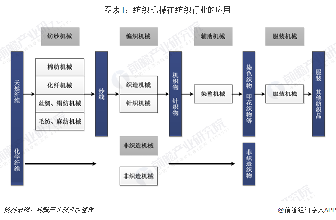 发布时间:2019-10-14 08:31:30,阅读次数:433 - 我国纺织机械行业基本情况纺织机械是指应用在纺织工艺各个环节中,把天然纤维或化学纤维加工成为纺织品所需要的各种机械设备的总称。纺织机械是我国纺织工业转变与革新的基础,是使我国纺织工业从劳动密集型向技术密集型转变的关键,是我国从纺织大国发展为纺织强国的重要基石。在主要的纺织流程中,纺纱机械首先将各种天然纤维和化学纤维纺成纱,织造机械将纱线织成布,然后印染机械对布料进行染色整理,最后通过服装机械将织物制成服装。