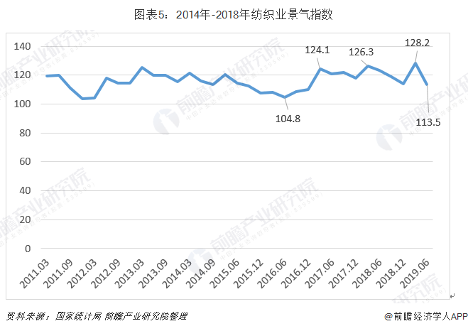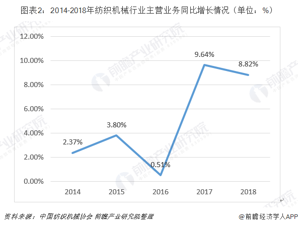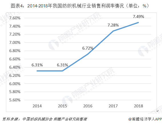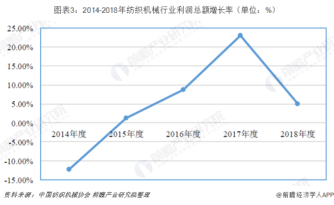利润水平变动主要系以下原因,首先,“十二五”中后期,世界经济复苏缓慢,国内经济由高速增长转向中高速增长的新常态,我国纺织工业增速明显放缓,作为纺织产业链上游的纺织机械行业,不可避免受到较大冲击。其次,国内外市场需求不足导致纺织机械行业内产生不良竞争等问题。纺机行业阶段性结构性调整一定程度上抑制行业利润水平的提升。最后,自2016年以来,我国纺机行业着力深化供给侧改革,伴随着下游纺织行业的景气度和纺织品内外销市场的回暖,订单量和产品价格呈上涨趋势,行业利润水平有所改善。下游纺织行业景气度回升,纺织机械产品需求回暖纺织机械行业的景气程度同下游纺织业的景气程度密切相关。据数据显示,纺织业从2013年开始进入长时间增速下滑阶段,从2016年下半年开始行业整体复苏迹象明显,从而带动纺织机械行业的景气程度回升。2018年,纺织行业利润总额为2766.10亿元,较2017年同比增长8.0%,增速较上年同期增长1.1%。