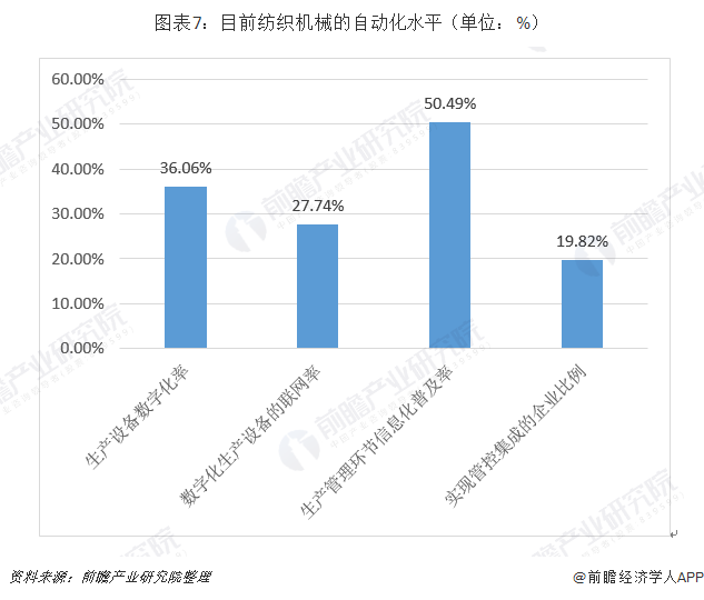 纺织机械的自动化不但可以提高纺织企业的生产效率、增大其盈利空间,还能提高信息化与集成应用水平,实现“减员、增效、提质、保安全”的目的。目前,国内纺织企业生产设备数字化率为36.06%,数字化生产设备的联网率为27.74%,生产管理环节信息化普及率为50.49%,实现管控集成的企业比例为19.82%。综上所述,纺织机械行业将在高可靠性、高技术和高附加值的高端化、智能化发展路线上持续迈进。