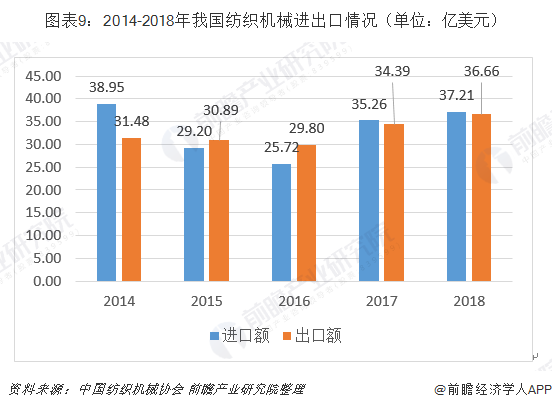 我国纺织机械主要出口至印度、越南、孟加拉、印尼、土耳其等国,其中印度是我国纺机出口的最大市场。2018年我国对一带一路地区出口纺机26.42亿美元,占我国纺机总出口额的72.06%,同比增长2.44%。与此同时,随着新疆资源优势禀赋的日益显现及投资环境的改善,尤其是发展纺织服装产业促进就业的多重政策实施以来,东部地区纺织产能有望加速向中西部转移。纺机行业进出口情况1、纺机行业进出口总体情况据海关统计,2018年我国纺织机械进出口累计总额为73.87亿美元,同比增长6.78%。其中:纺织机械出口36.66亿美元,同比增长7.20%;进口37.21亿美元,同比增长6.36%。2014年至2018年,我国纺织机械出口呈现“稳中有升”态势,进口金额总体呈下降趋势。