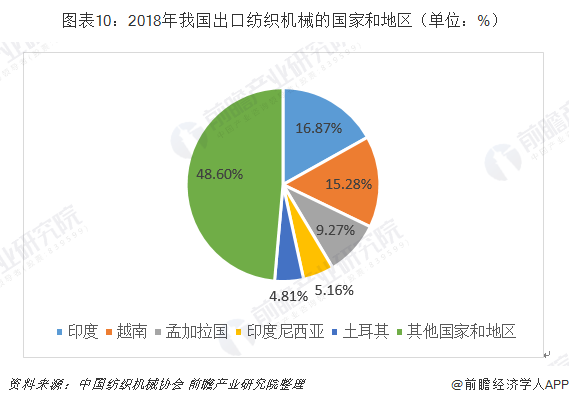 2、我国纺织机械的出口分国别情况2018年全年,我国共向188个国家和地区出口纺织机械产品36.66亿美元,同比增长7.20%,其中前五位出口国分别为印度、越南、孟加拉国、印度尼西亚和土耳其。